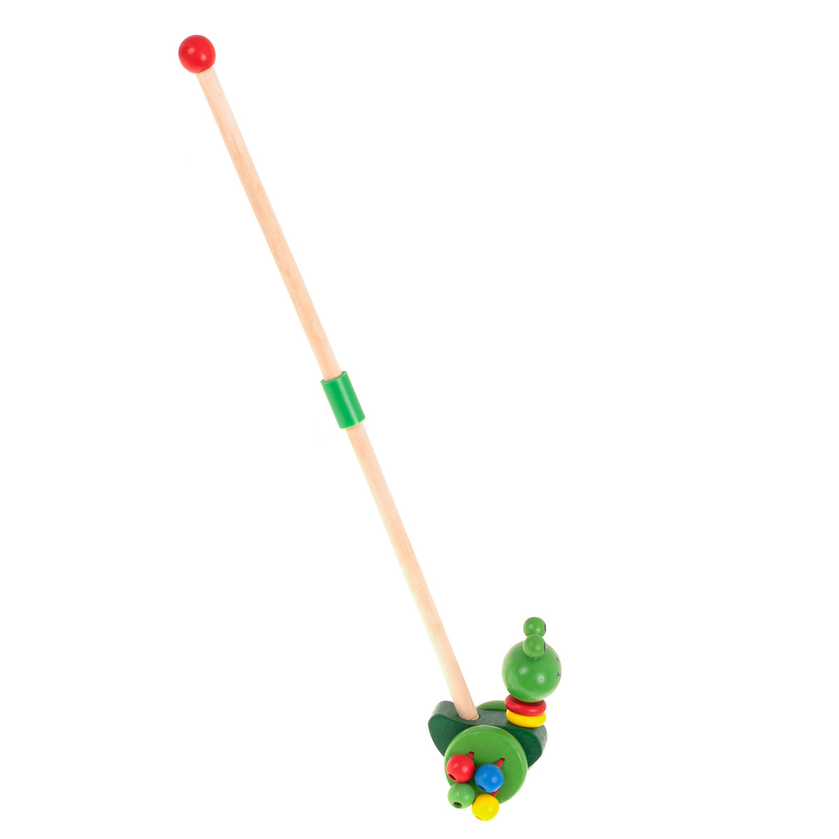 Dřevěná hůl lze snadno odmontovat. Žabka je vybavena 2 velkými koly. Na každém kole jsou připevněny 4 barevné korálky, které během jízdy chrastí. Hračka je vyrobena s důrazem na každý detail. Hrany hračky byly pečlivě obroušeny, aby se dítěti při hře nevytvořily třísky.