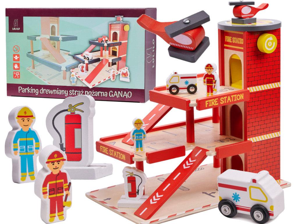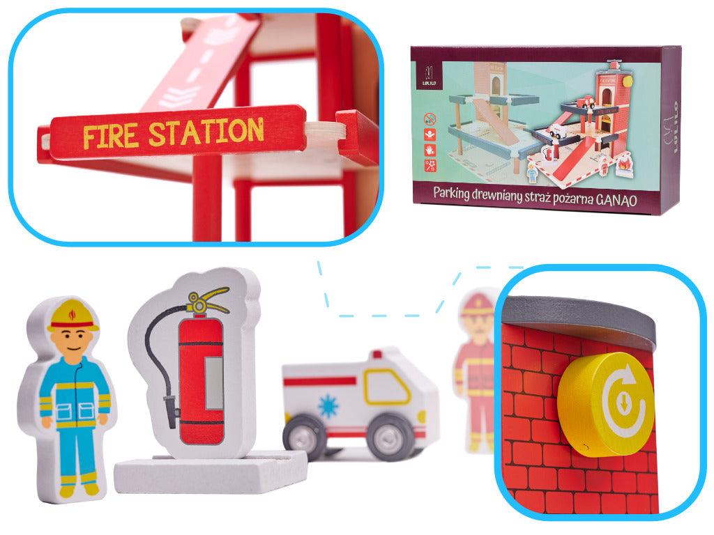 - Parkovací garáž Lulilo Ganao nabízí čtyři úrovně pro vozidla a vrtulník, včetně hasicího přístroje.- Dřevěná sada podporuje logické myšlení a manuální dovednosti dětí.- Perfektní dárek pro budoucí hasiče se dvěma vozidly a doplňky.