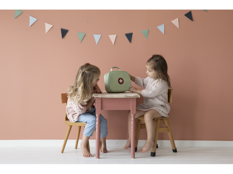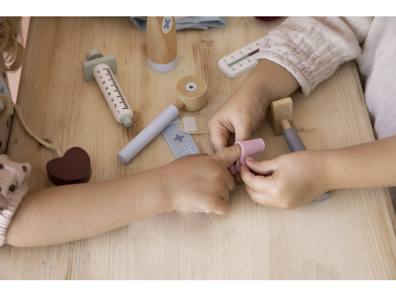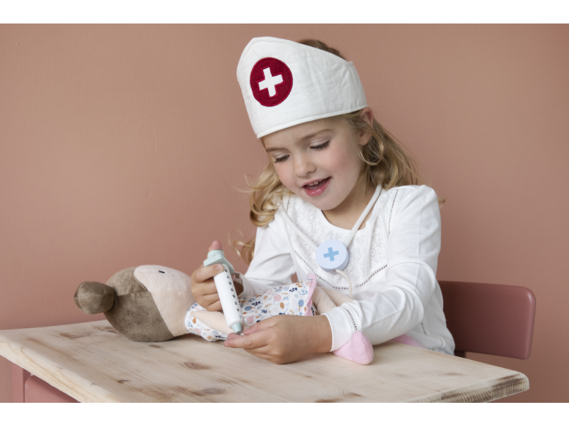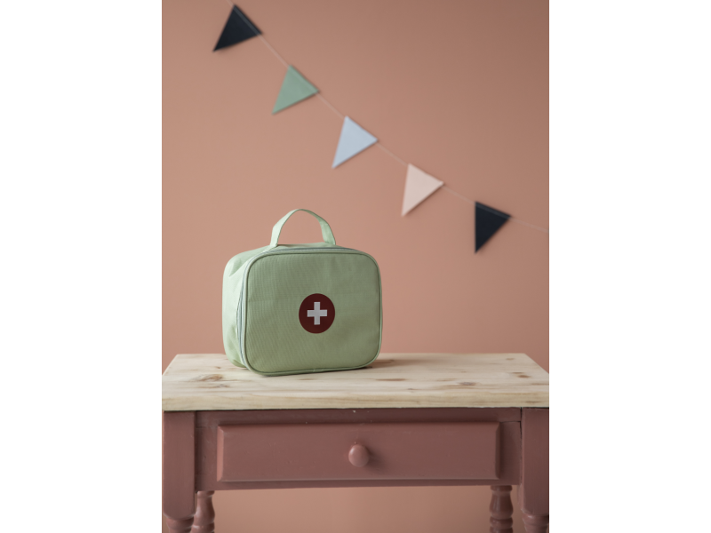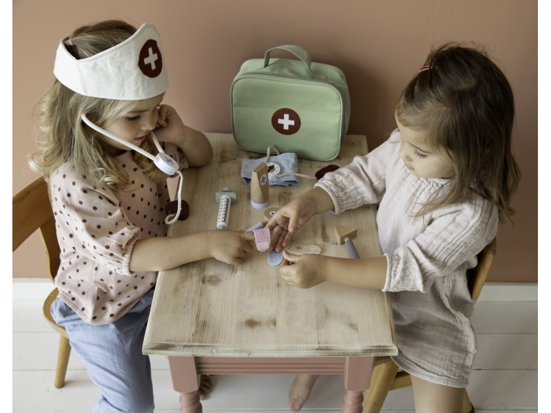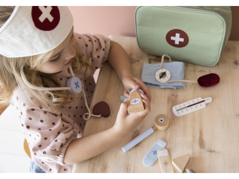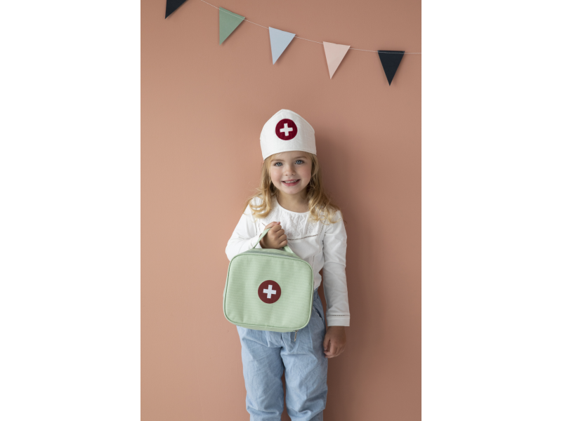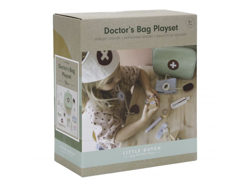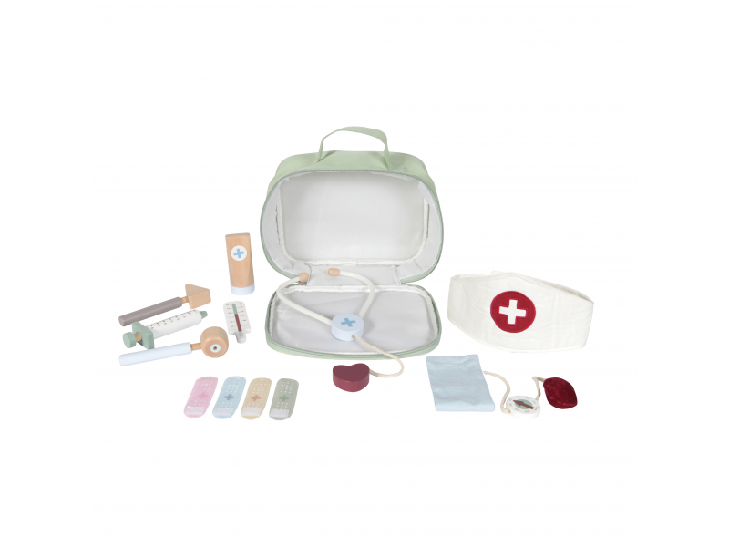 Sada obsahuje plátěnou lékařskou brašnu, náplast (4 různé barvy), dřevěný teploměr, stříkačku, tubu s mastí, stetoskop, reflexní kladivo, měřič krevního tlaku, otoskop, čepičku.