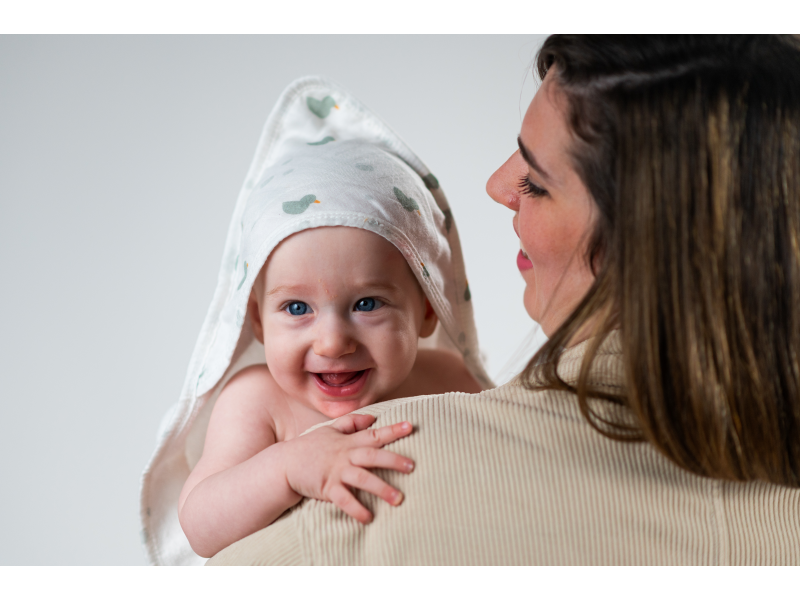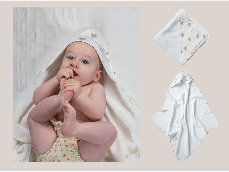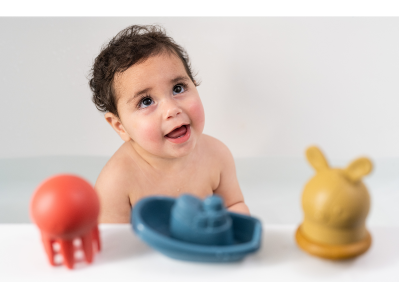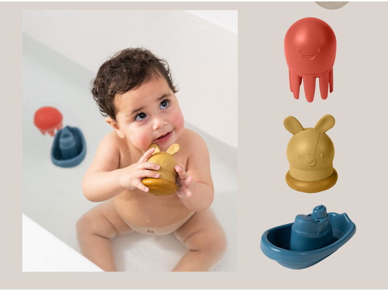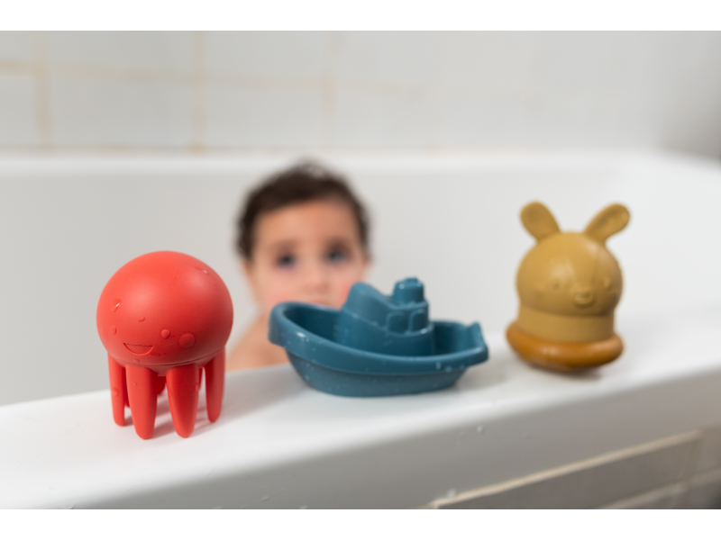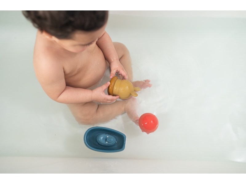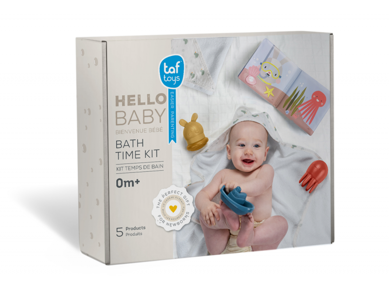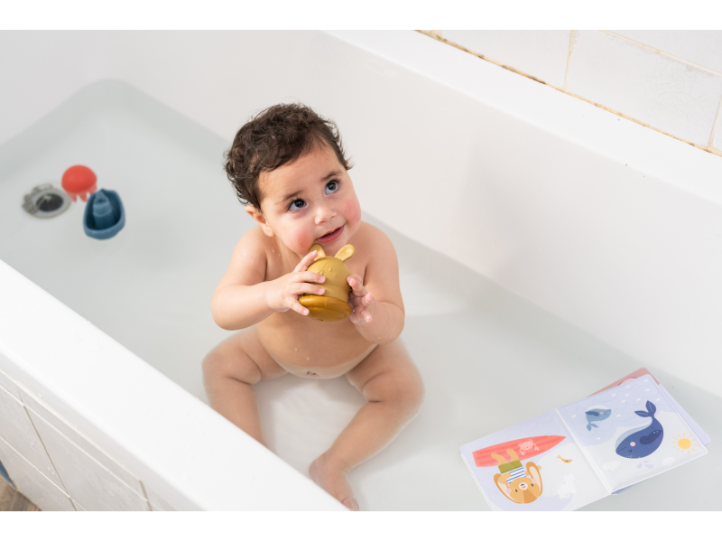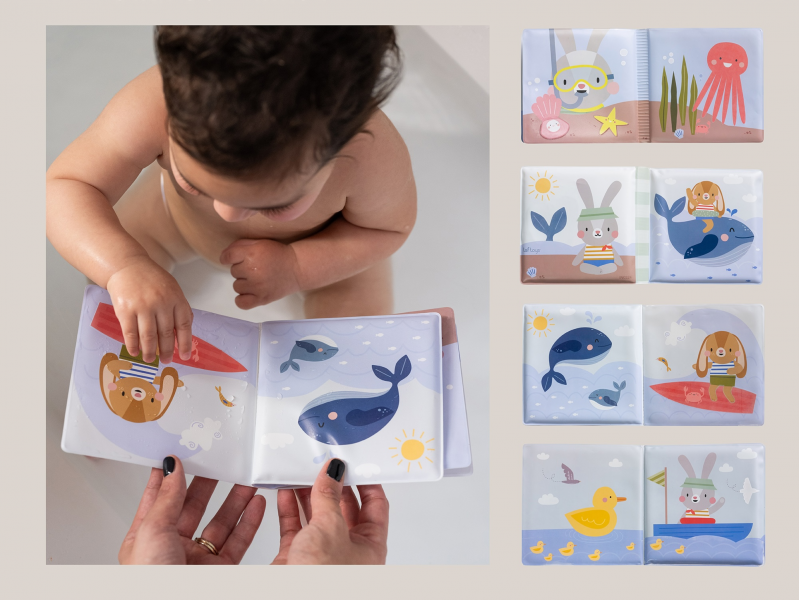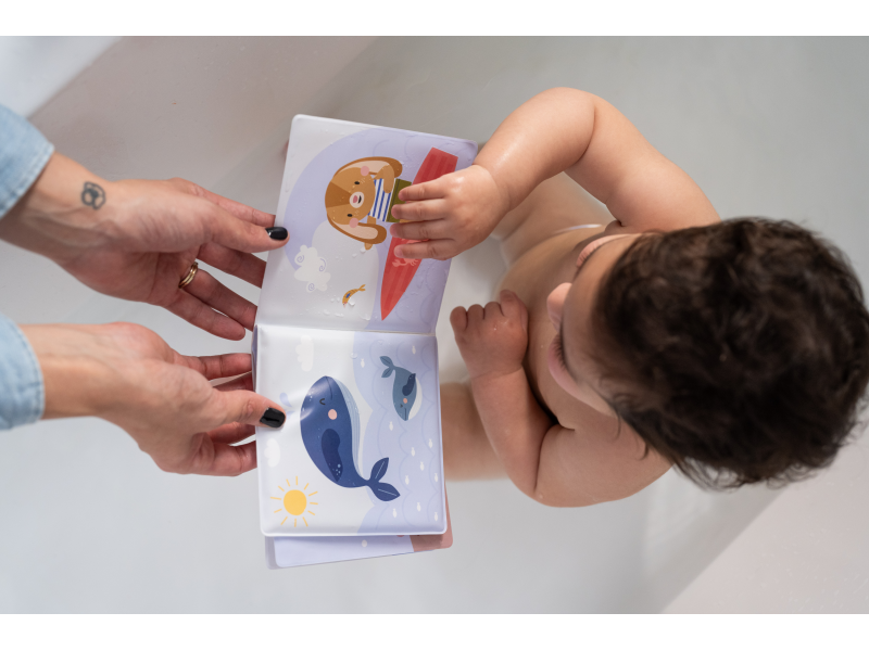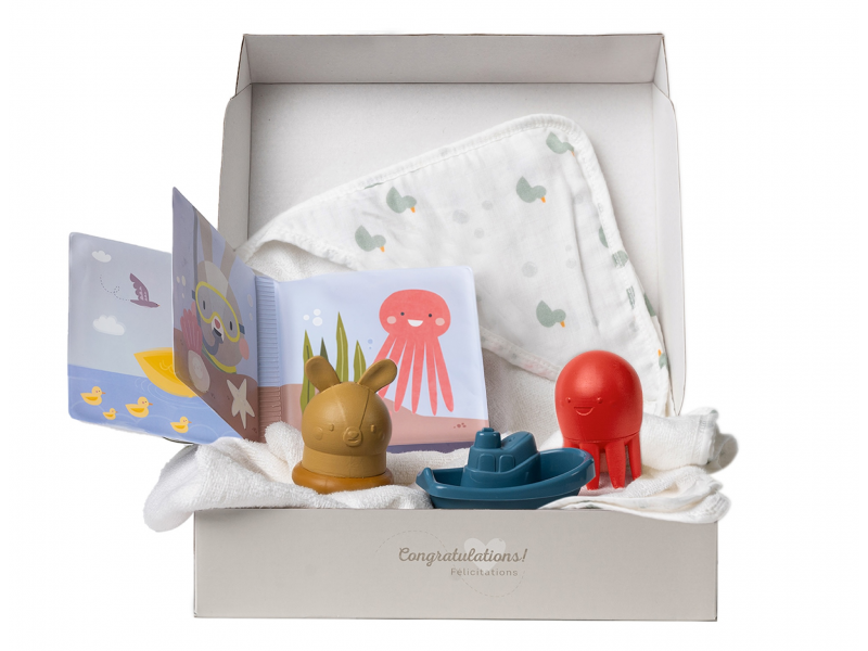 Dárková sada hraček do koupele s motivy ze života na moři obsahuje dvě stříkací šroubovací hračky do vody, lodičku, omyvatelnou knížku s krásnými ilustracemi a jemnou měkkou osušku s kapucí.