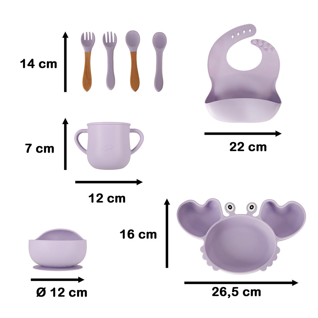 S touto rozkošnou silikonovou jídelní sadou ve tvaru kraba bude každé jídlo pro Vaše dítě zábavou! Obsahuje vše, co malý strávník potřebuje: talíř s přepážkami, misku s ochranou proti rozlití, hrníček se dvěma víčky (včetně víčka se slámkou), příbor (s dřevěnými prvky) a praktický bryndák s kapsou.