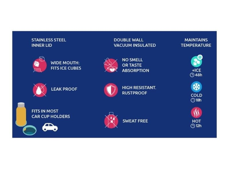 Termoska Quokka Solid z vysoce kvalitní dvoustěnné oceli se spolehlivým, 100% těsnicím uzávěrem udrží váš nápoj dle potřeby teplý či studený. Široké hrdlo umožňuje vložení kostek ledu. Termoska udrží teplotu studeného nápoje s ledem až 48 hodin, studeného nápoje až 18 hodin a teplého nápoje až 12 hodin.