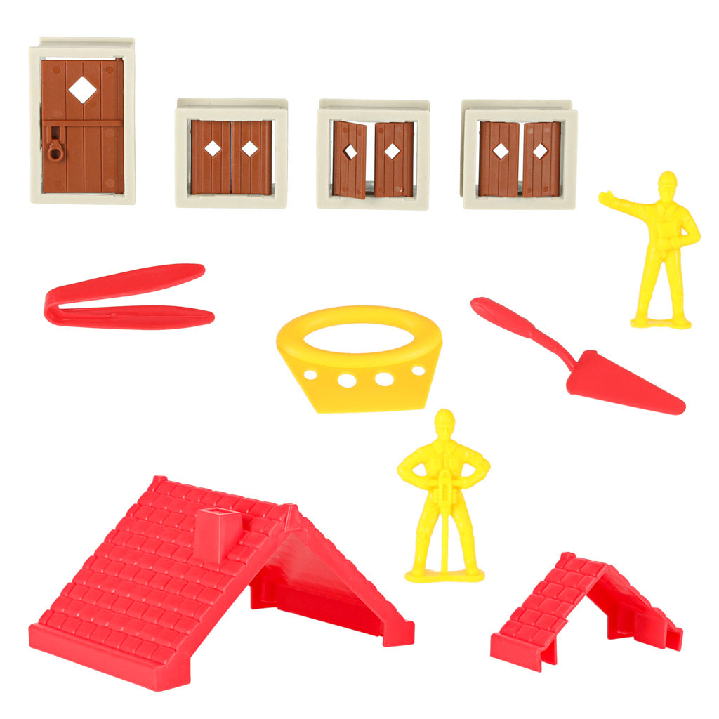 - Dílky k sestavení domku: základy, střecha, dveře, okna, rámy