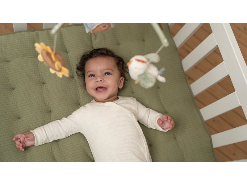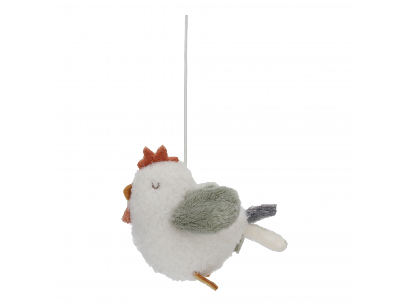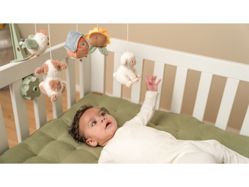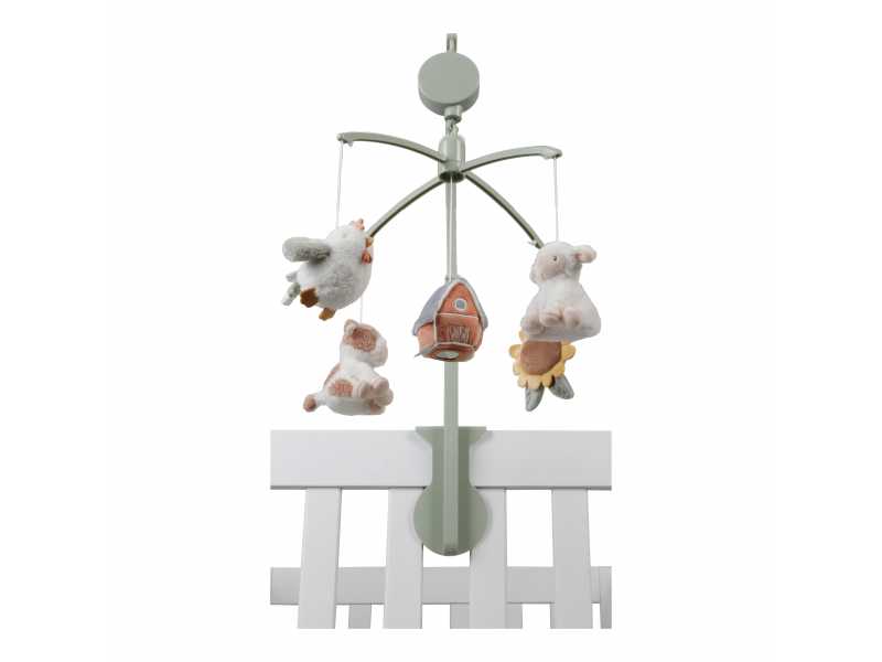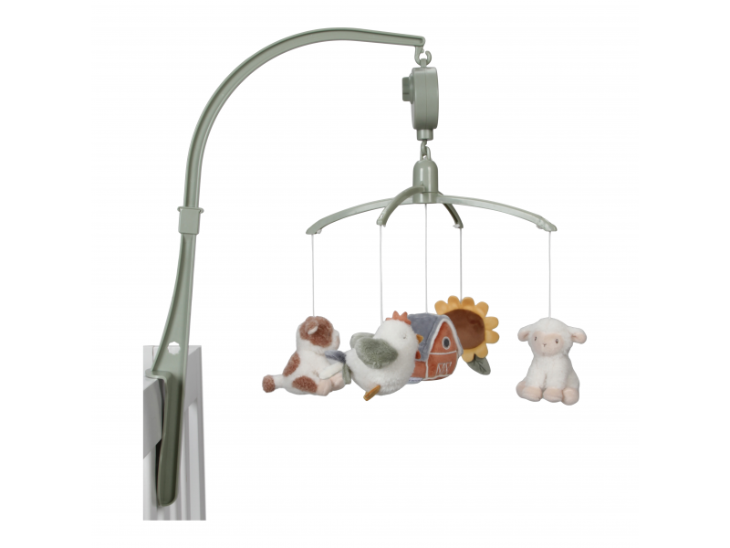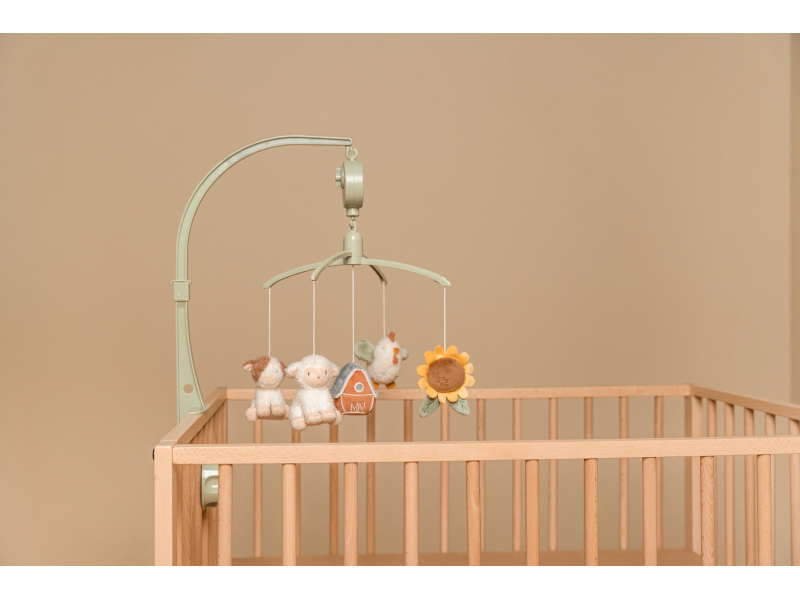 Kolotoč s natahovacím hudebním boxem hraje něžnou ukolébavku pro klidné usínání. Pozornost dítěte upoutají otáčející se plyšové hračky v podobě ovečky, slepičky, kravičky, slunečnice a domečku. Kolotoč snadno připevníte na bočnici postýlky.