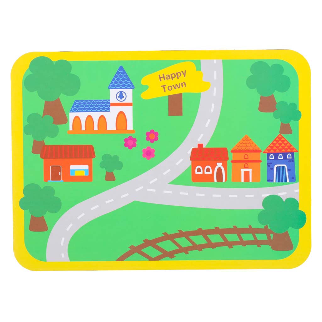 - Praktická herní tabulka – barevná kartonová podložka s ilustrací města slouží jako pozadí pro kreativní příběhy a usnadňuje tematickou hru.