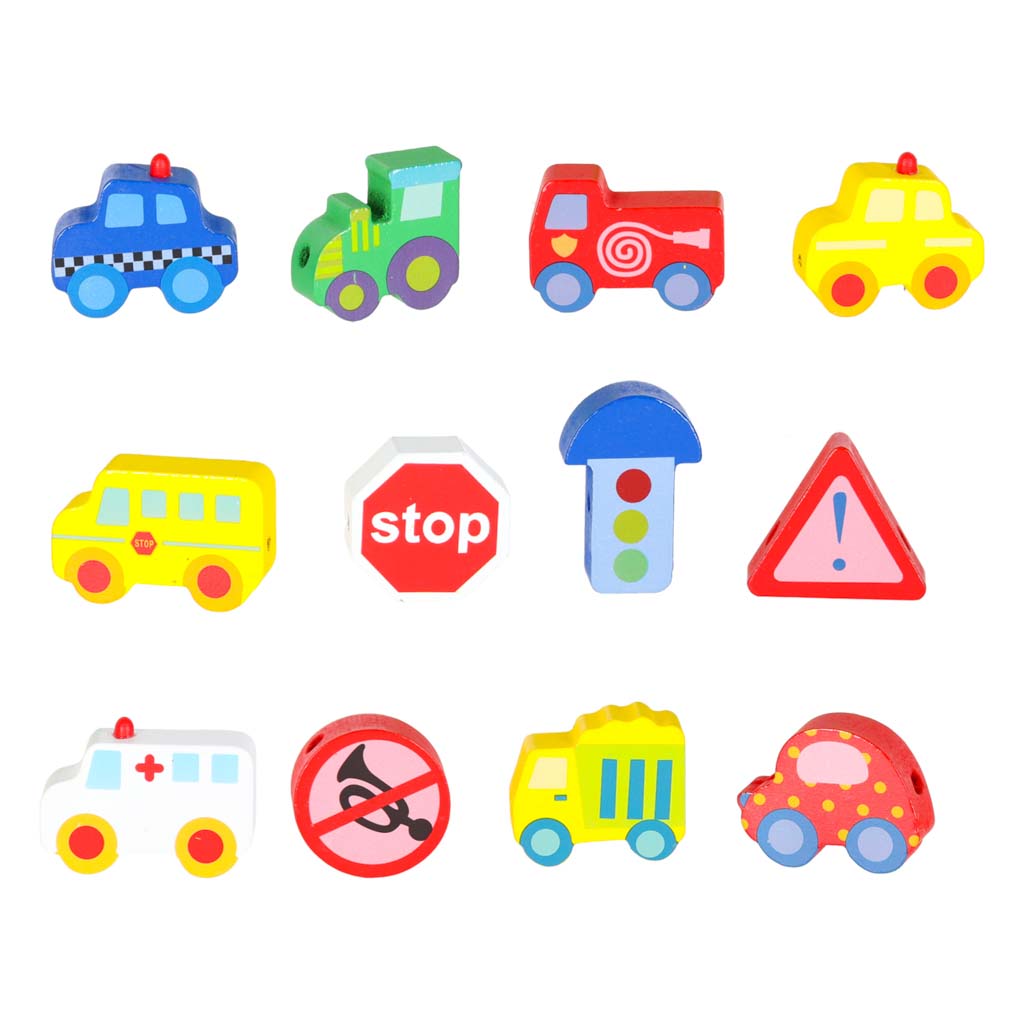 - 12× dřevěné kostky s motivem dopravních prostředků
