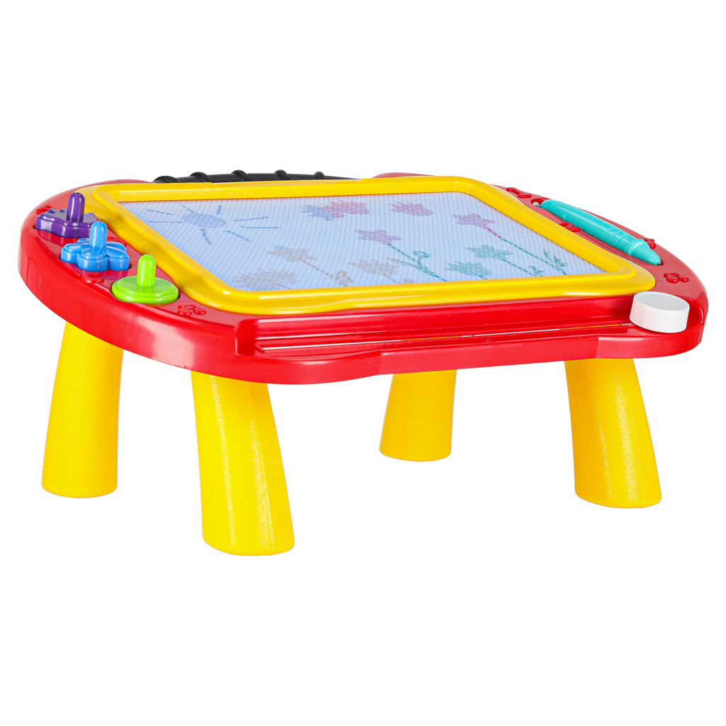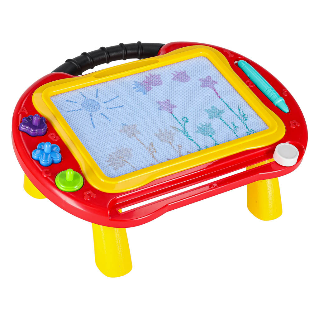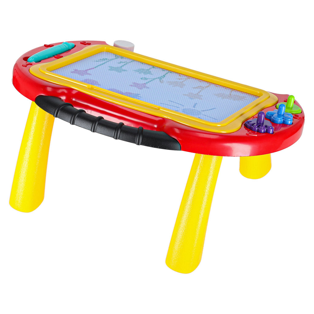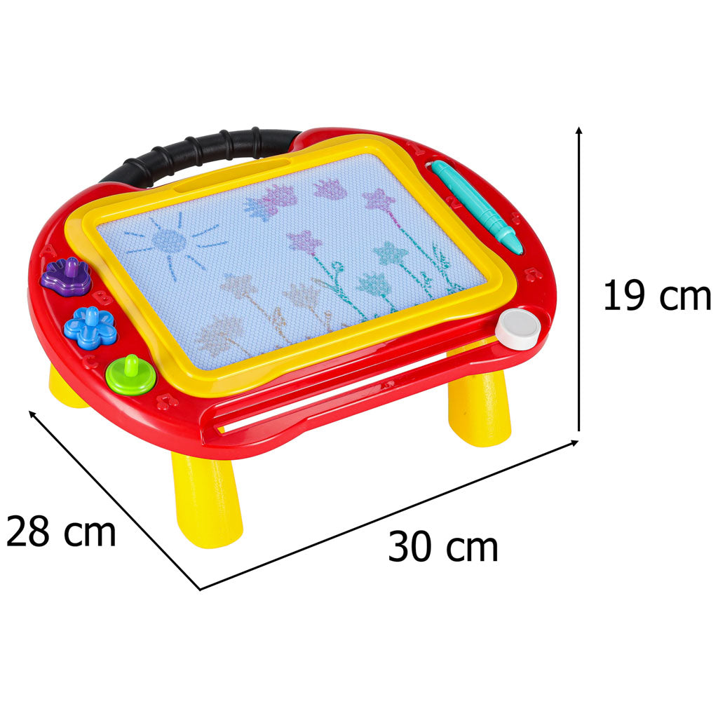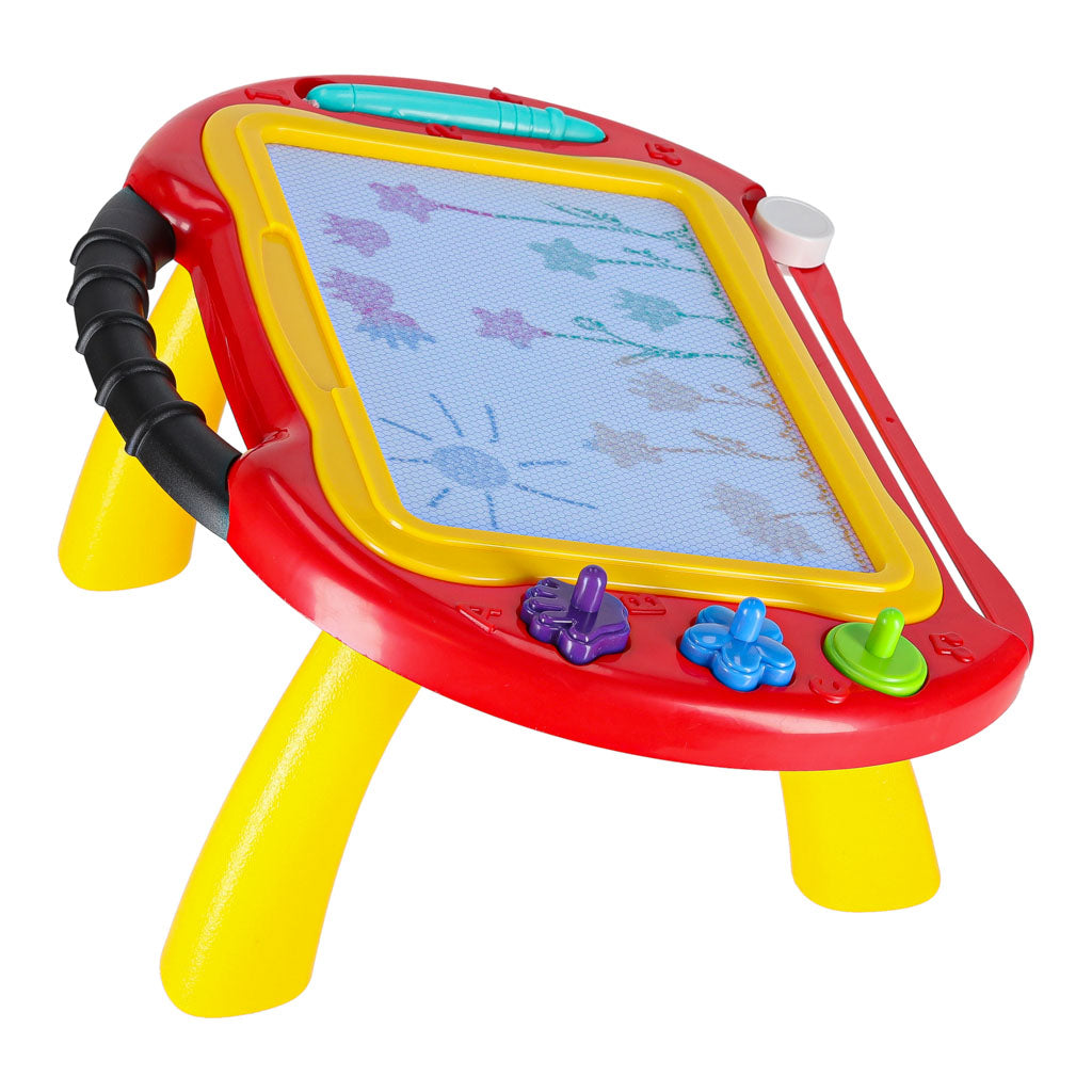 Tato magnetická kreslicí tabulka se stolečkem je ideálním pomocníkem pro rozvoj kreativity u malých dětí. Umožňuje kreslení ve 4 barvách a díky posuvníku lze kresby snadno vymazat a začít znovu. Díky odnímatelným nožkám ji lze využívat jako stolek nebo přenosnou tabuli – ideální doma i na cestách.