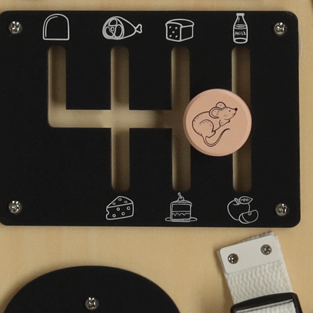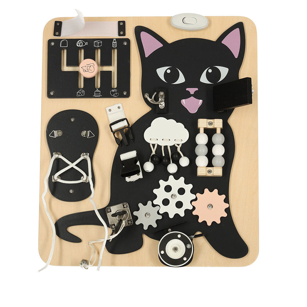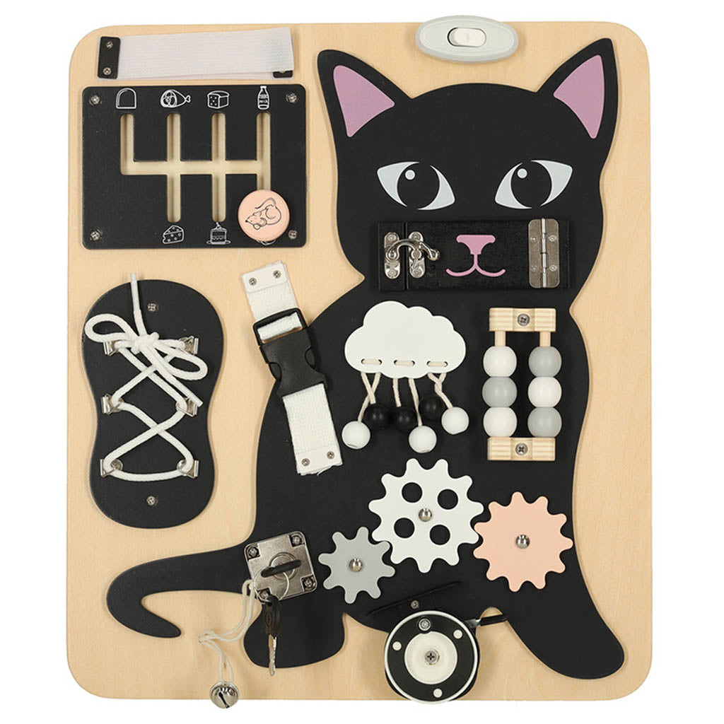 Senzorická manipulační tabule LULILO KICIAO ve tvaru roztomilého kocourka je ideální pomůcka pro rozvoj jemné motoriky, logického myšlení a samostatnosti u dětí. Tato didaktická tabulka nabízí široké spektrum aktivit – dítě může zapínat klipsy, šněrovat tkaničky, otáčet, přepínat a zkoumat různé mechanické prvky.