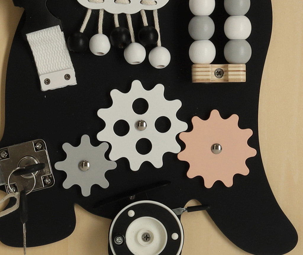 - Stimulace smyslů – tabule kombinuje různé textury, zvuky a pohyby