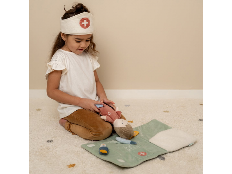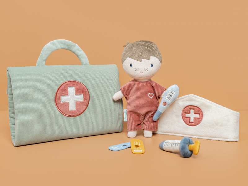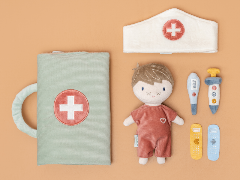 Originální sada s panenkou Jimem a lékařskými doplňky v krásném provedení z jemného plyšového materiálu. Jim se necítí dobře a bude potřebovat vyšetřit a uložit do postýlky. Váš malý lékař nebo lékařka si nasadí čepec a s pomocí teploměru zkontroluje Jimovi teplotu. Pokud bude potřeba zahájit léčbu, má k dispozci injekční stříkačku i náplasti.