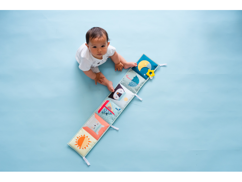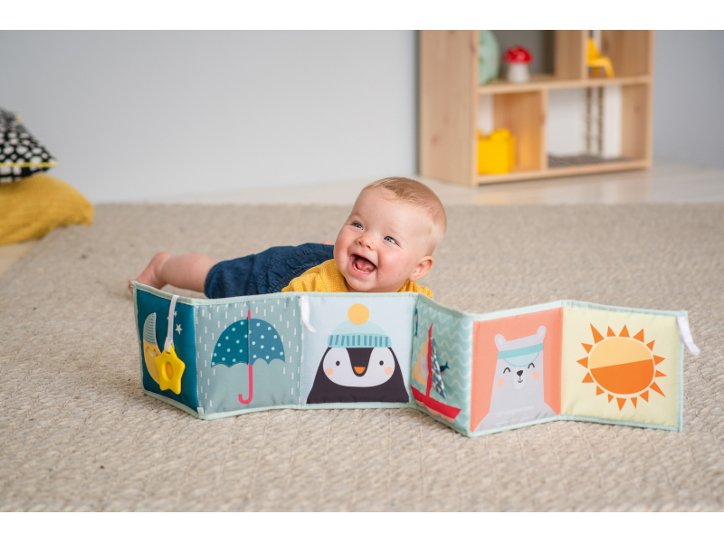 Od 3 měsíců: strana s barevnými obrázky a různorodými texturami ke zkoumání, které podporují rozvoj smyslů a jemné motoriky dítěte.