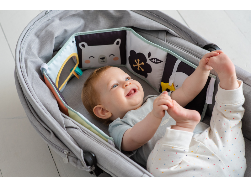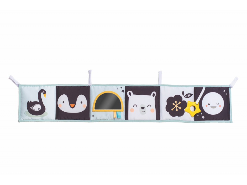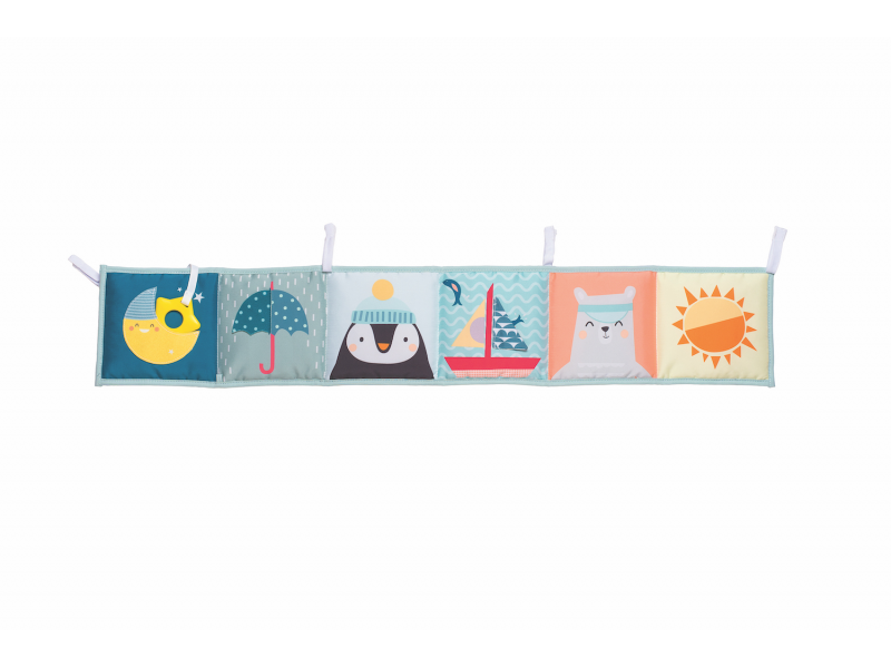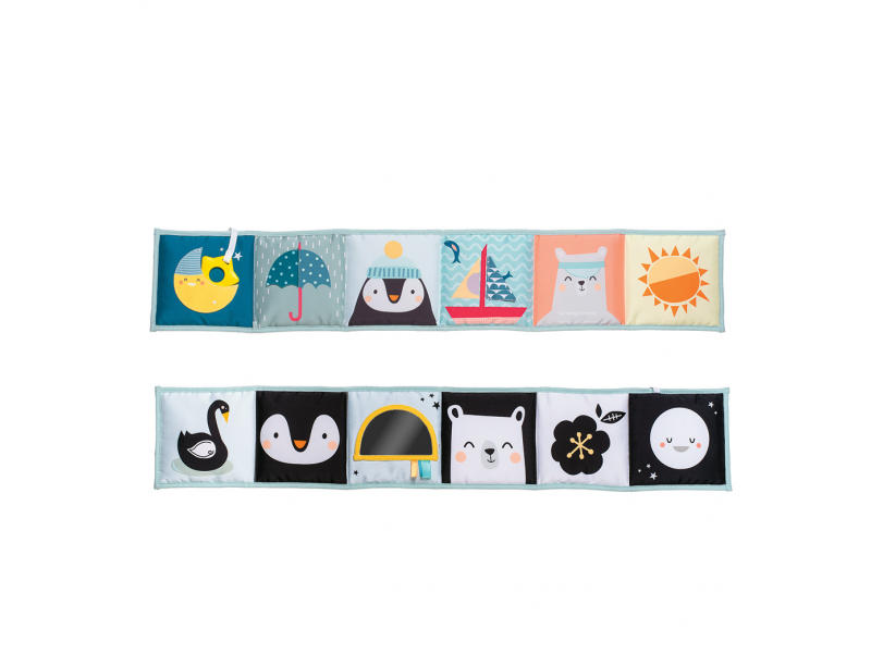 Oboustranná textilní knížka pro nejmenší je určena do kočárku, postýlky i na hrací deku.