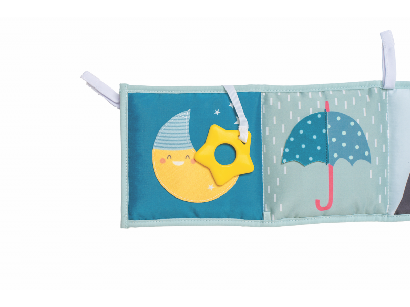 Knížka drží postavená samostatně nebo je možné ji připevnit pomocí poutek se suchým zipem např. na postýlku.