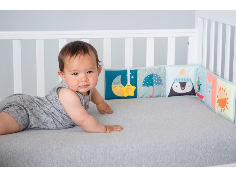 0-3 měsíce: strana s bezpečným zrcátkem a vysoce kontrastními obrázky v základních barvách, které podněcují rozvoj smyslů a emoční inteligence dítěte.