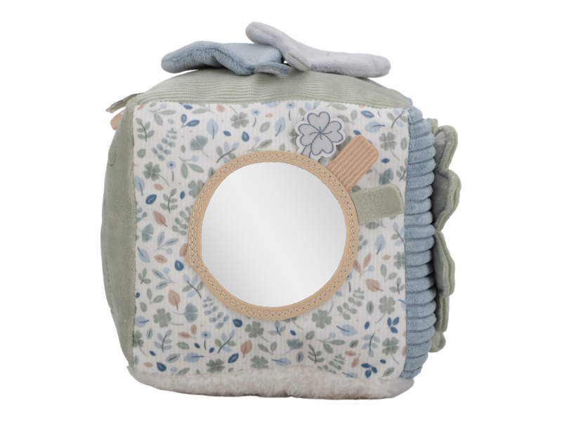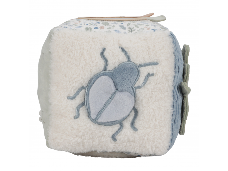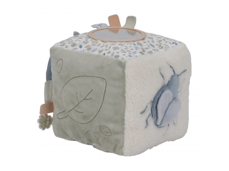 Měkká plyšová kostka je díky svému provedení snadno uchopitelná malými dětskými ručičkami. Různorodé textury, připevněné hračky a vyšívané ilustrace motivů ze života v lese lákají dítě ke zkoumání, kostka navíc při pohybu jemně cinká.