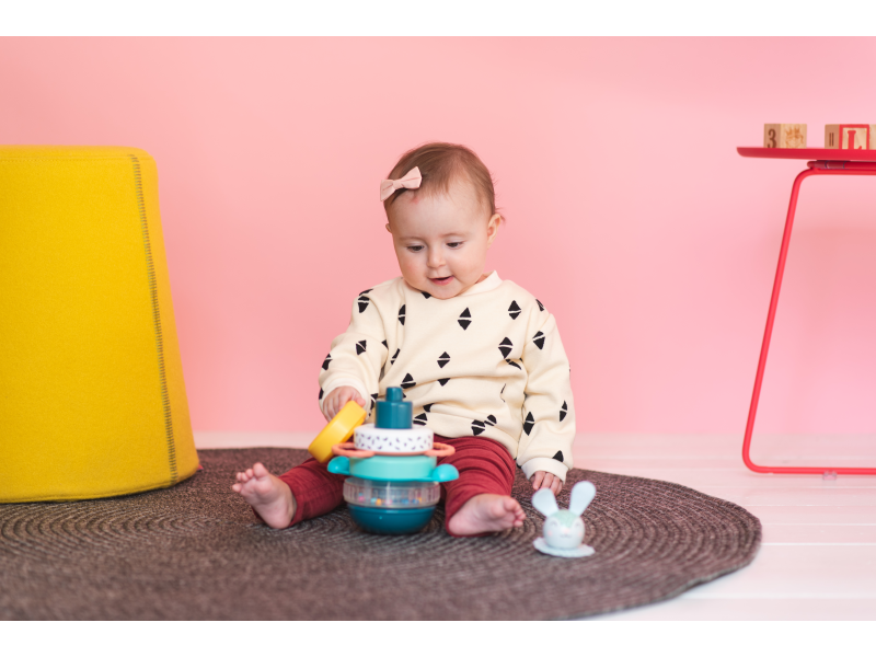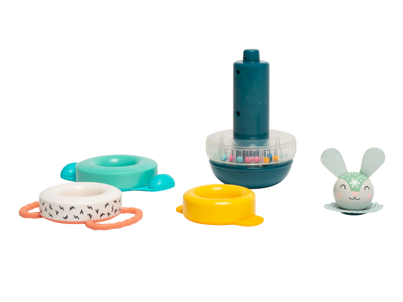 Pyramida je tvořena kulatou základnou a nasazovacími kroužky různých barev a velikostí. Dítě se snaží umístit kroužky ve správném pořadí a vytvořit z nich pyramidu. Jako poslední přijde na řadu hlavička králíčka. Největší kroužek je průhledný a naplněný chrasticími korálky, další tři kroužky mají držadla různých tvarů usnadňujících jejich uchopení.