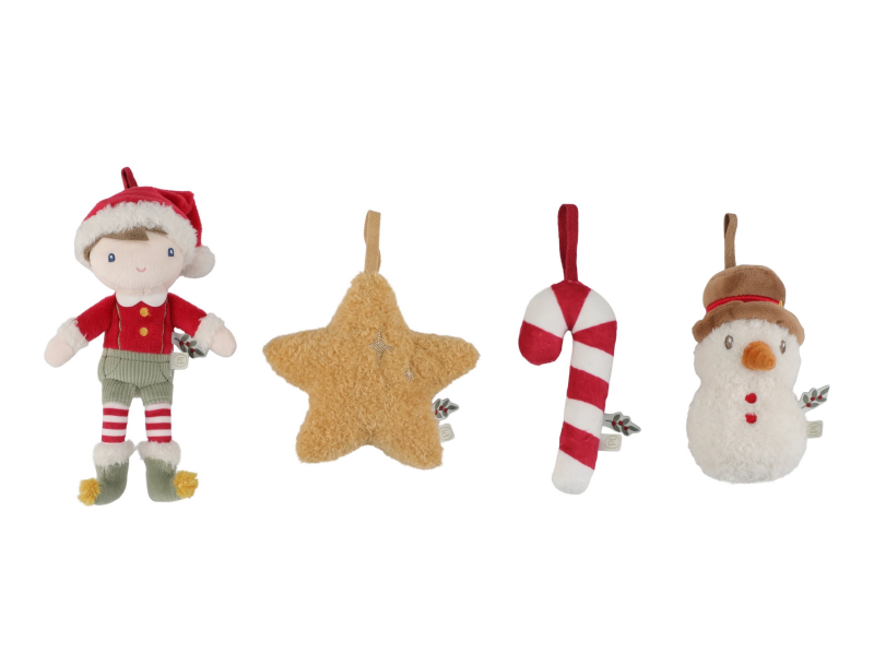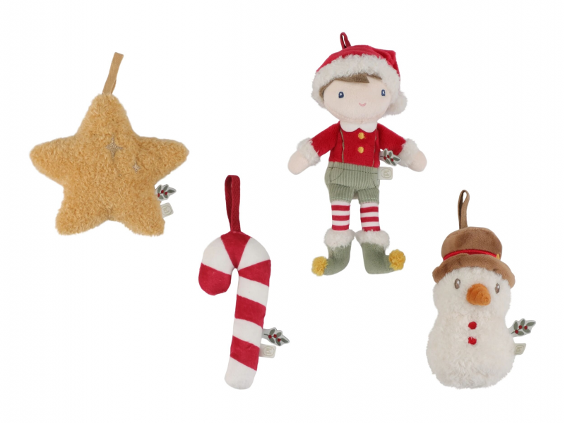 Roztomilá sada čtyř plyšových ozdob Little Dutch vnese do vašeho domova hřejivou atmosféru Vánoc. V dárkovém balení najdete postavičku Jima ve vánočním oblečení, usměvavého sněhuláka, sladkou cukrovou hůlku a zářivou hvězdu. Díky měkkému a lehkému materiálu jsou ozdoby bezpečné pro malé děti a snadno se věší na vánoční stromek, větvičku nebo girlandu. Společné zdobení stromku se tak stane kouzelným rodinným okamžikem, který si budete užívat rok co rok.